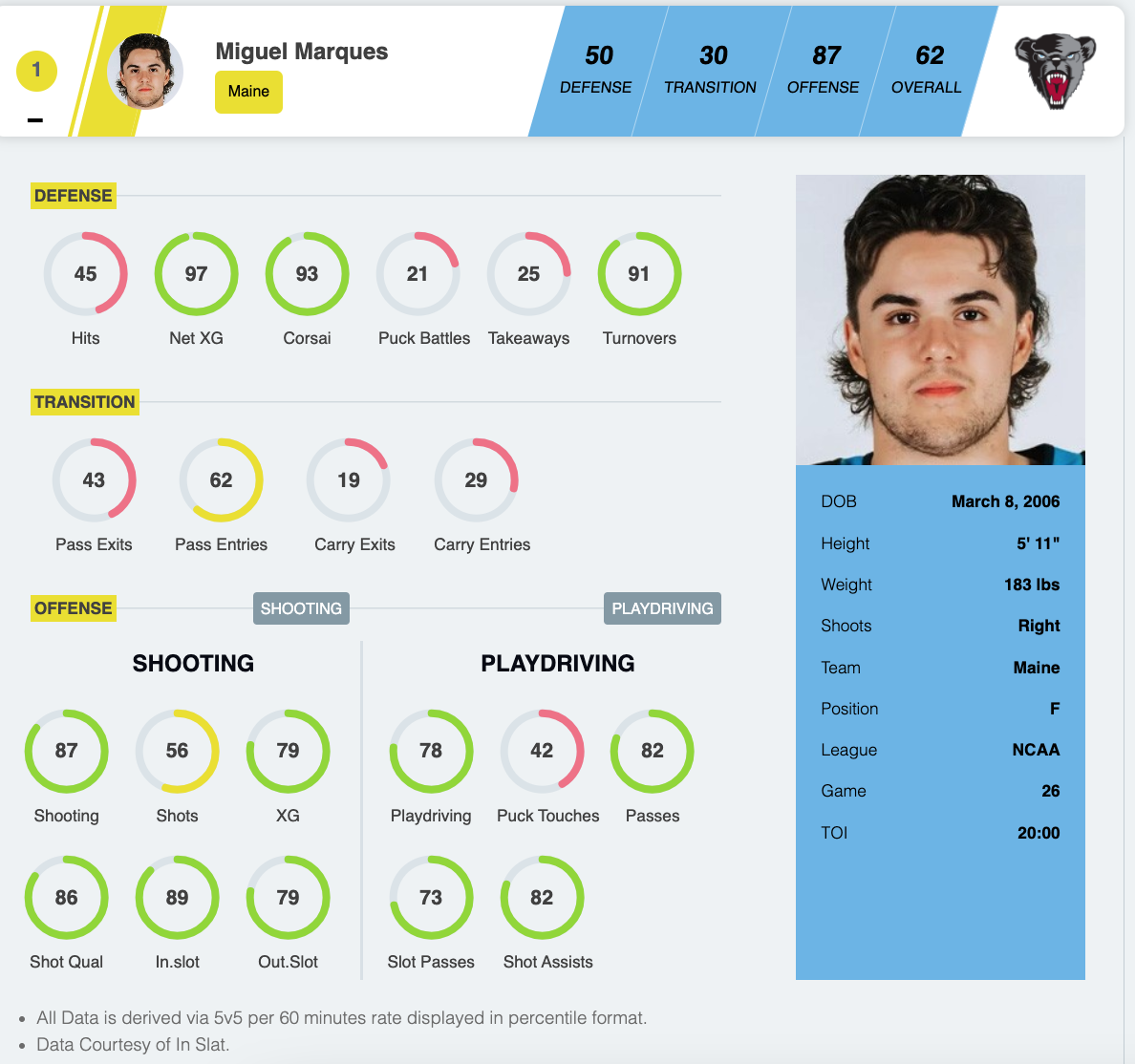 Marques oozes offensive skill and his game is predicated on a combination of puck skills and a strong shot. He can drive play with his offensive talents, as evident by 20 of his 23 points last year being primary points, and 8 of them being on the powerplay. He averaged about 3 shot attempts per game, completed 84% of his passes, and was second on Maine with 65 scoring chances per InStat data. Maine played to a +8 shot differential when he was on the ice. Another intangible of Marques’ game is confidence and swagger that some may call “feisty” on the ice– he is not afraid to stand up for himself on the ice, though it will be important for him to keep it in check to avoid any unnecessary penalties. He did well last year, taking only 9 minor penalties all year.